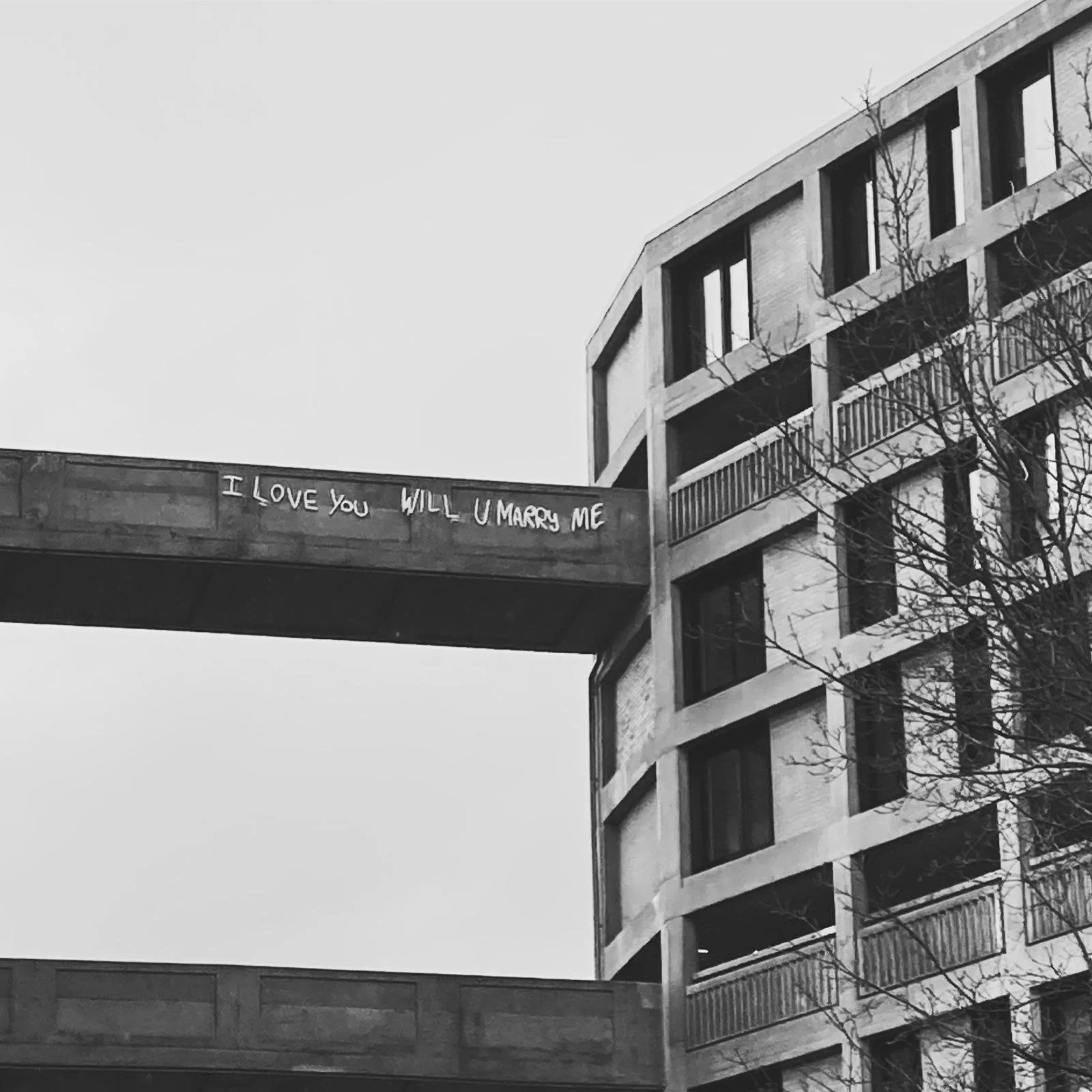 I love you, will you marry me? says the neon on the concrete bridge, a statement of love for council estates.